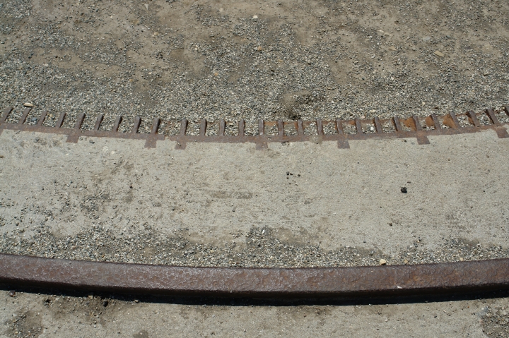 Close-up of the curved rail on which the gun mount turned and the gear track used to turn it.
