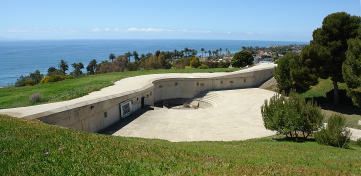 Looking down at the gun mount and surrounding embankment for Battery Osgood