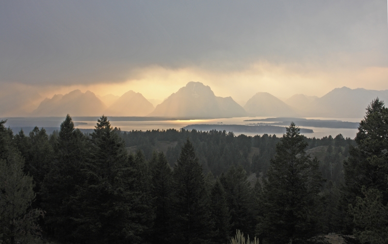This view of the Tetons at sunset gives an indication of the overcast conditions and smoky atmosphere.